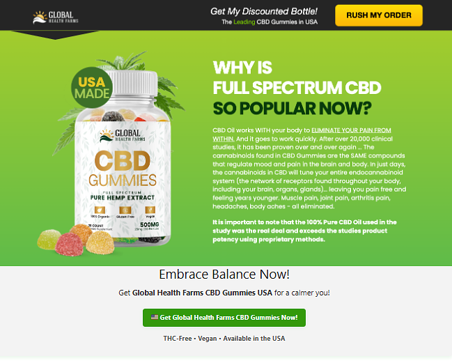 Global Health Farms CBD Gummies USA offer a tasty, reliable path to natural calm, pain relief, and better sleep. With broad-spectrum CBD, organic ingredients, and 4.5/5 Trustpilot ratings, they provide subtle, consistent support without THC risks. Ignore scam ads—buy official for lab-tested quality and 90-day guarantee. For those in the USA seeking enjoyable CBD, Global Health Farms CBD is a smart, low-risk choice with a healthy lifestyle. Try them for balanced days ahead!